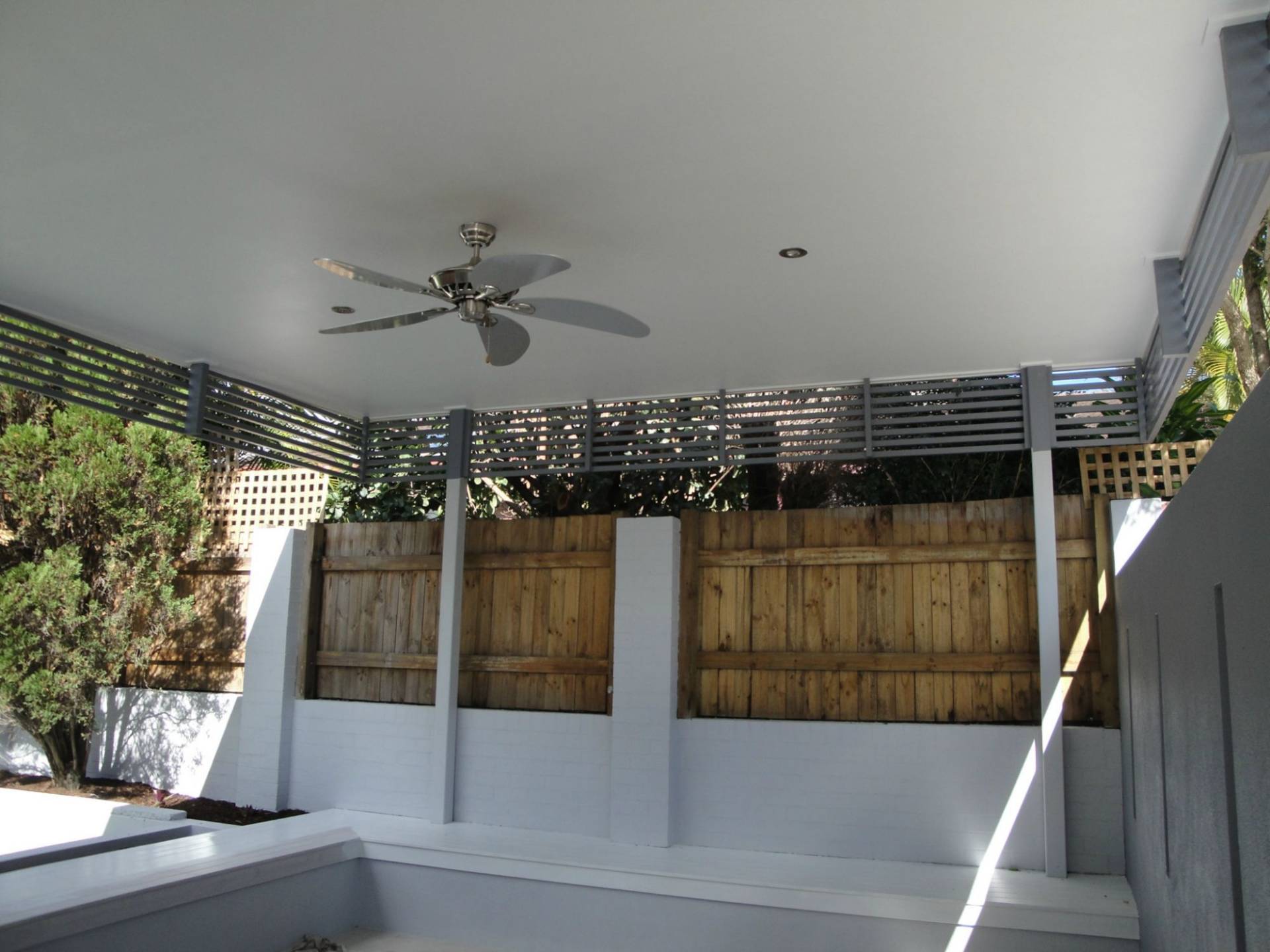 - Outdoor entertaining bbq area with ceiling fan and bench seating around the edges