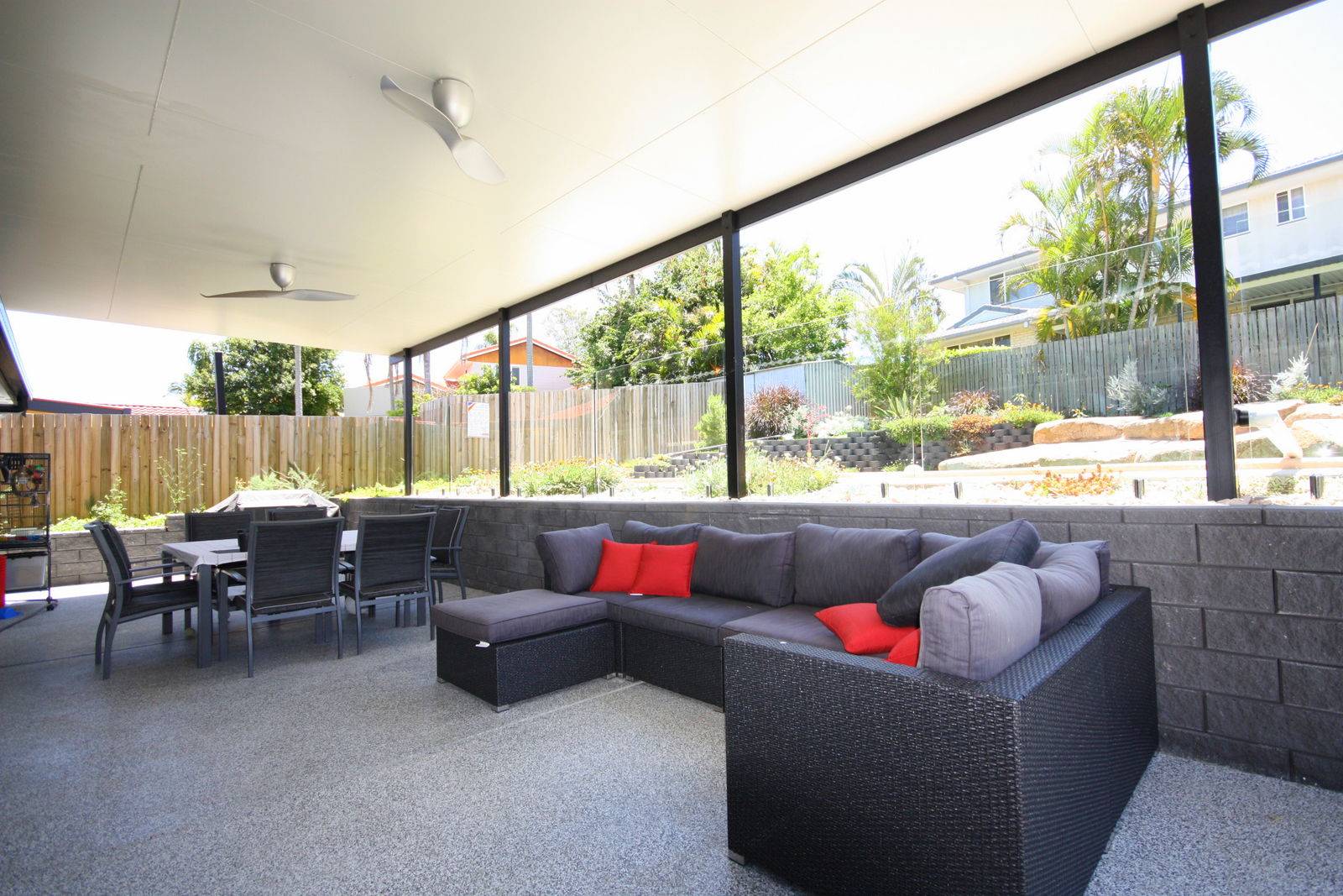 - Massive covered outdoor entertainment area with ceiling fans