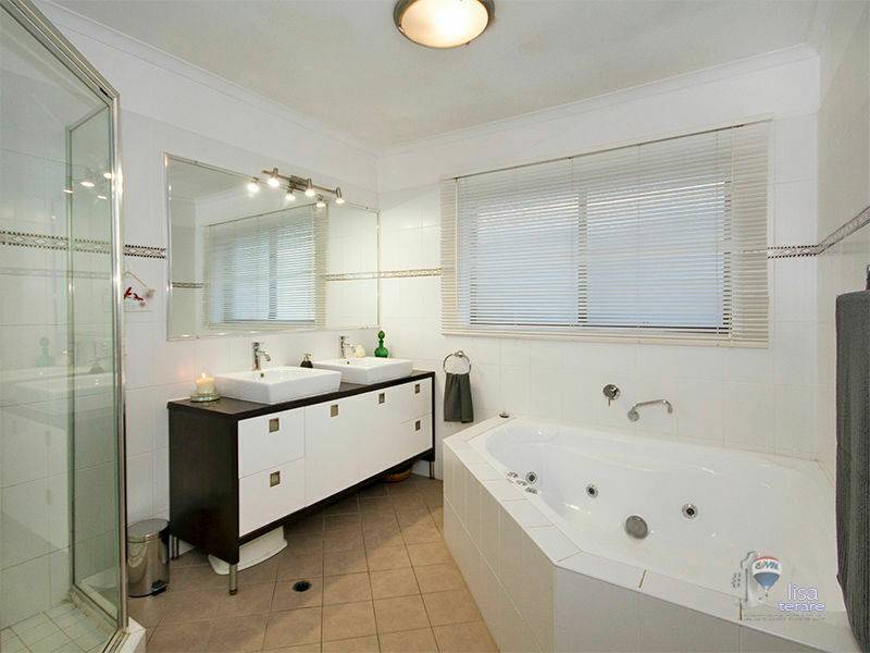 - Modern main bathroom with spa bath and dual vanity.