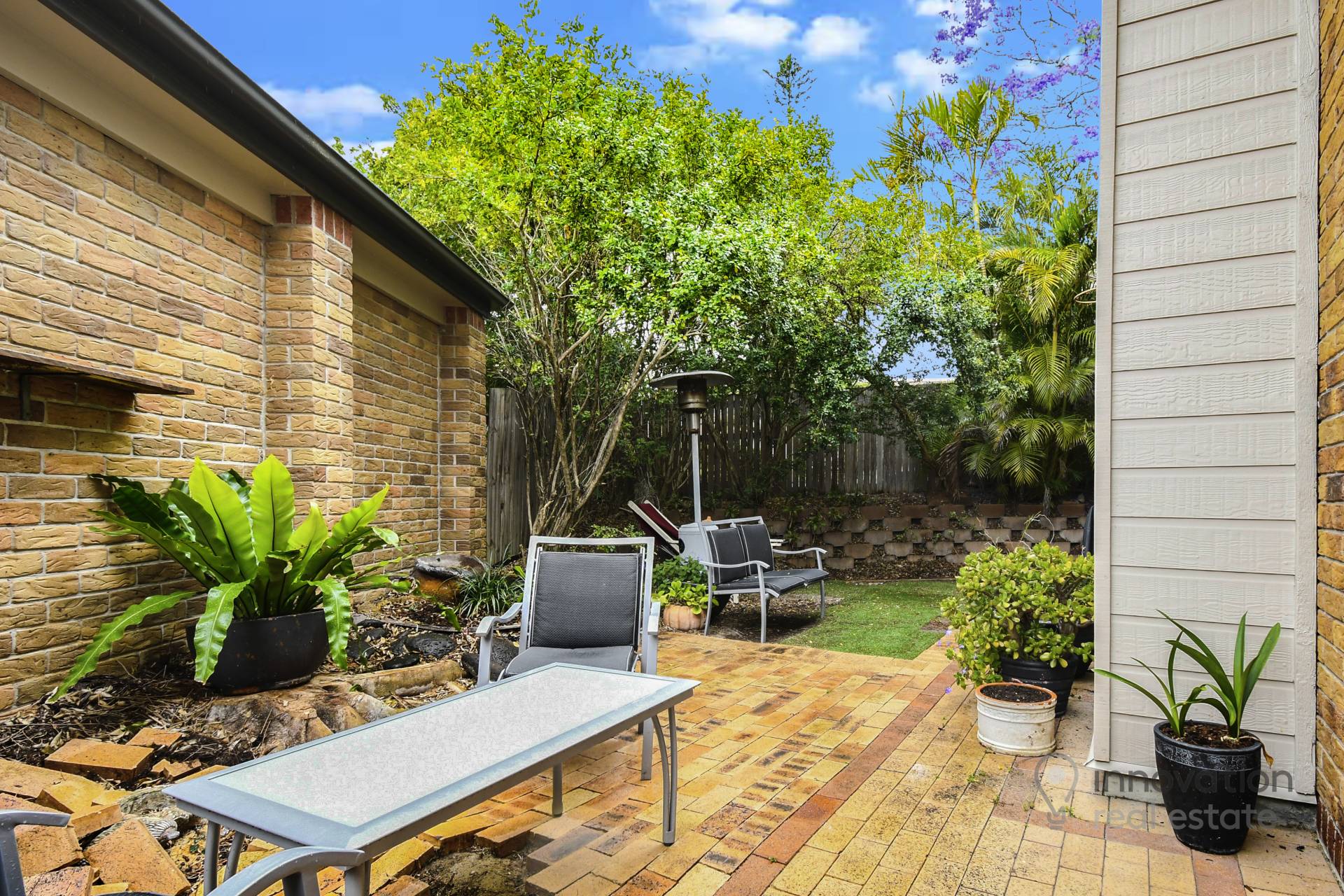 The courtyard area can be accessed from the dining/living area and is surrounded by well-established gardens.
